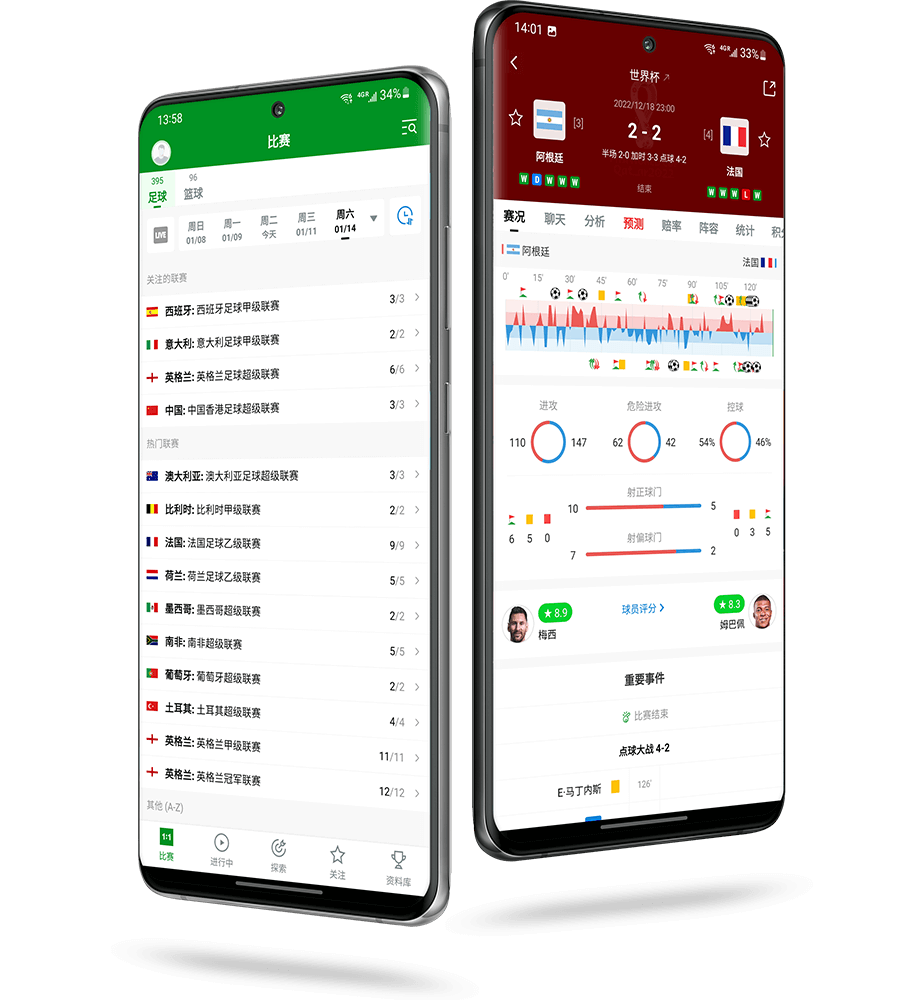 专业的足球比分直播、篮球比分直播App,每日免费足球比赛预测、推荐,自媒体专家赛事分析,及时的赛事进程图表、历史对阵、赛程赛果、进球事件、动画直播、红黄牌、控球率、进攻等实时统计数据。